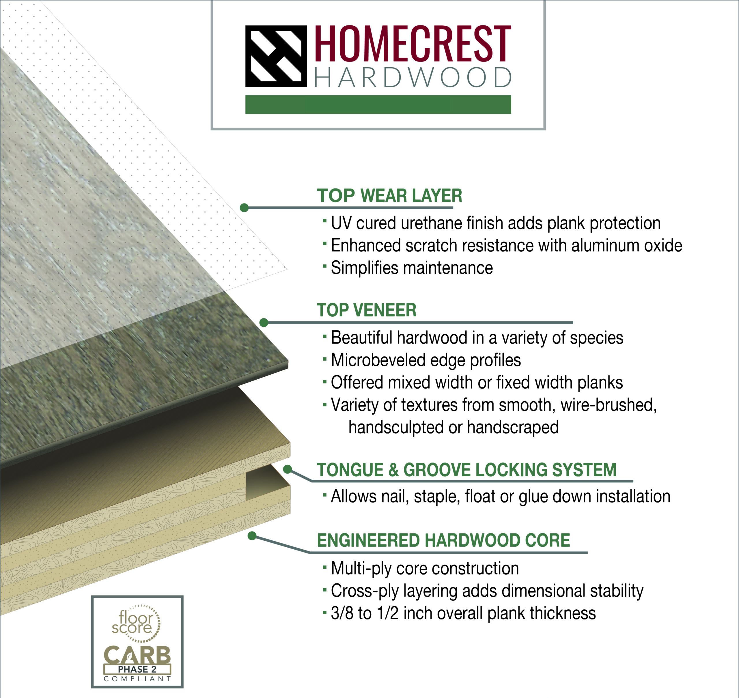 Homecrest Hardwoods are approved for use above, at or below grade and can be installed over radiant heat systems; made possible due to their superior multi-layered construction. In addition to enhanced plank stability, engineered hardwood easily contends with the beauty and unique visuals of solid wood floors. To protect and preserve the visual layer, each Homecrest line of engineered wood flooring has UV cured urethane with scratch resistant aluminum oxide in the top wear layer. This is why we feel confident offering a 25-year residential warranty on our engineered wood products with some even covering up to 50 years! Easy installation, simple care & maintenance, and a wide assortment of textures, finishes, and board widths all make it easy to see why Homecrest engineered hardwoods will be flooring you’ll love to live with for a long time.